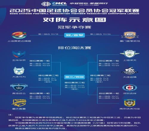 10月25日、26日,2025中冠总决赛交叉排位赛阶段,将展开第一轮第二回合较量,8支球队将继续捉对厮杀,争进四强,进而角逐1.5个冲乙名额,具体对阵为: