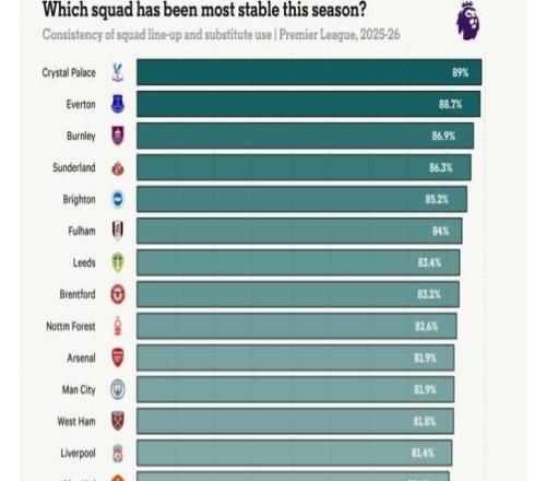 TA列本赛季英超各队阵容稳定度:水晶宫最高,切尔西轮换最多 -