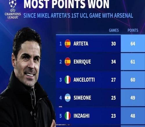 自执教阿森纳欧冠首秀以来,阿尔特塔欧冠拿分所有主帅第一 -